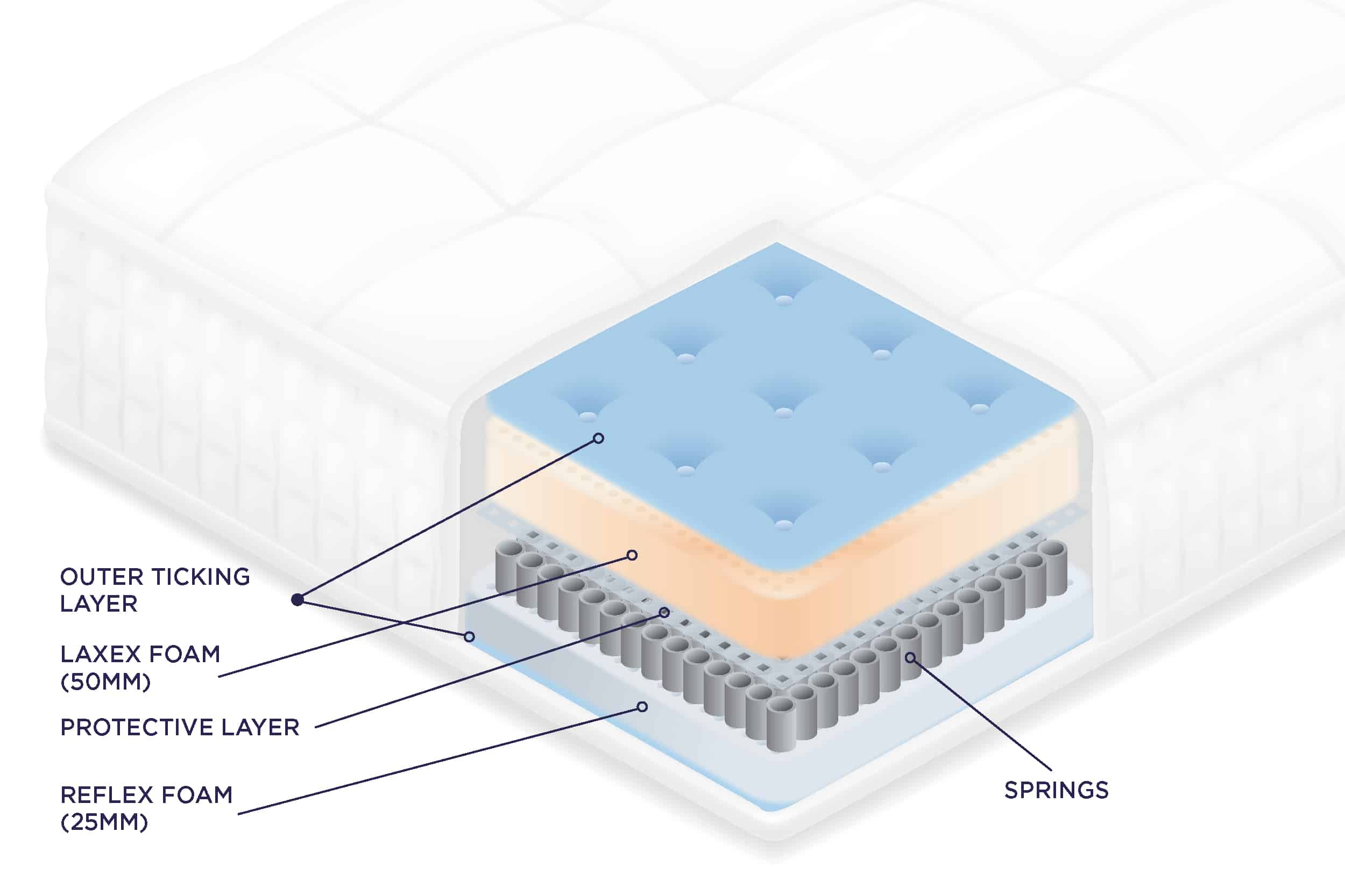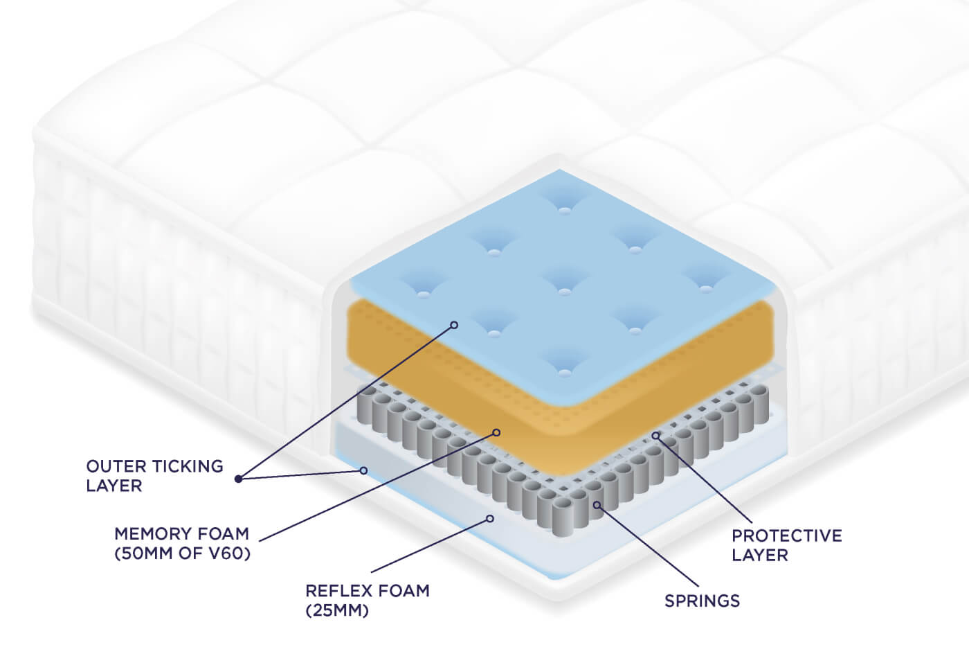 The Saturn includes a 50mm top layer of V60 Visco-Elastic memory foam, as well as a 25mm internal layer of Reflex foam – a high-density material which helps the bed mould to your body shape and takes spinal alignment into account.